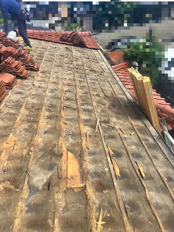 八尾市で瓦屋根の雨漏りでご相談、瓦の下を調査すると土と野地板が剥き出しの状態