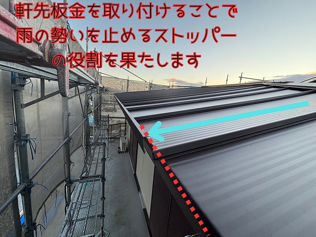 瀬戸市坂上町二階建て一軒家にて立平ガルバリウム板金屋根にリフォーム! 立平の気になる雨だれ対策、トイ(雨樋)から水が飛び出すのを防ぐ軒先板金の施工をご紹介