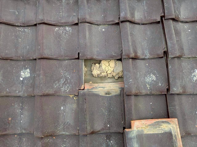 加西市で瓦のひび割れと漆喰の劣化を確認!雨漏り調査と部分補修を行いました