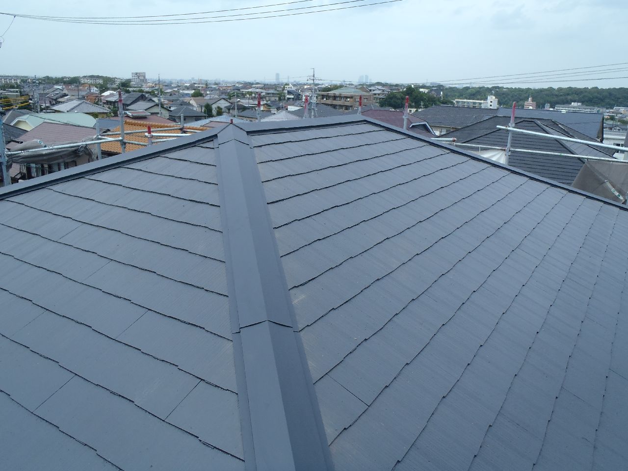 調布市多摩川にて雨漏りのスレート屋根を葺き替え工事|重厚感あるエコグラーニで美しく仕上げました